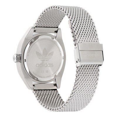 Diese Adidas Uhr hat ein Edelstahl Gehäuse mit einem Durchmesser von 43 mm und ist mit einem Armband aus Metall versehen. In der Uhr arbeitet ein Timex Uhrwerk. Das Glas der Uhr besteht aus Mineral - Glas.