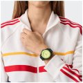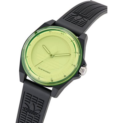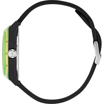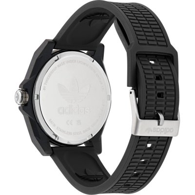Diese Adidas Uhr hat ein Kunstharz Gehäuse mit einem Durchmesser von 41 mm und ist mit einem Armband aus Kunstharz versehen. In der Uhr arbeitet ein Timex Uhrwerk. Das Glas der Uhr besteht aus Acryl - Glas.