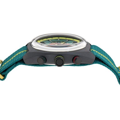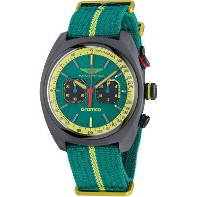Diese Aston Martin Uhr hat ein Kunstharz Gehäuse mit einem Durchmesser von 43 mm und ist mit einem Armband aus Nylon versehen. In der Uhr arbeitet ein Timex Uhrwerk. Das Glas der Uhr besteht aus Acryl - Glas.