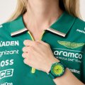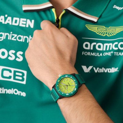 Diese Aston Martin Uhr hat ein Kunstharz Gehäuse mit einem Durchmesser von 40 mm und ist mit einem Armband aus Kautschuk versehen. In der Uhr arbeitet ein Timex Uhrwerk. Das Glas der Uhr besteht aus Mineral - Glas.