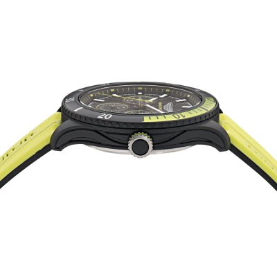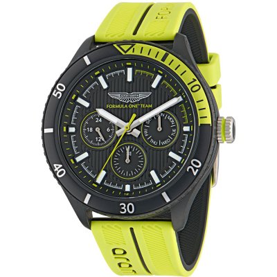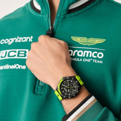 Diese Aston Martin Uhr hat ein Kunstharz Gehäuse mit einem Durchmesser von 46 mm und ist mit einem Armband aus Kautschuk versehen. In der Uhr arbeitet ein Timex Uhrwerk. Das Glas der Uhr besteht aus Mineral - Glas.