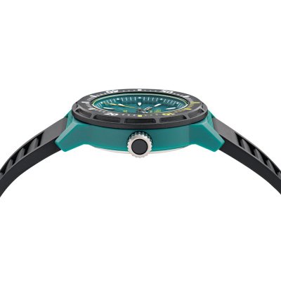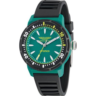 Diese Aston Martin Uhr hat ein Kunstharz Gehäuse mit einem Durchmesser von 40 mm und ist mit einem Armband aus Kautschuk versehen. In der Uhr arbeitet ein Timex Uhrwerk. Das Glas der Uhr besteht aus Mineral - Glas.