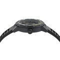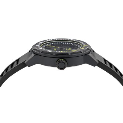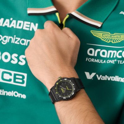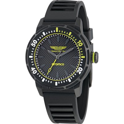 Diese Aston Martin Uhr hat ein Kunstharz Gehäuse mit einem Durchmesser von 40 mm und ist mit einem Armband aus Kautschuk versehen. In der Uhr arbeitet ein Timex Uhrwerk. Das Glas der Uhr besteht aus Mineral - Glas.