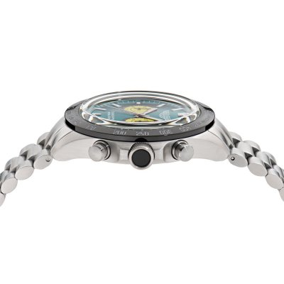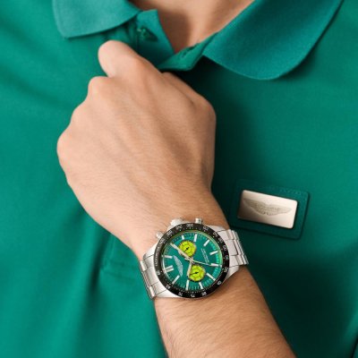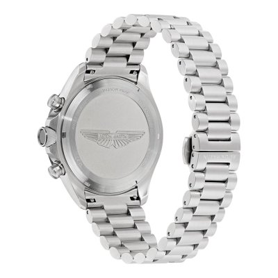 Diese Aston Martin Uhr hat ein Edelstahl Gehäuse mit einem Durchmesser von 44 mm und ist mit einem Armband aus Edelstahl versehen. In der Uhr arbeitet ein Timex Uhrwerk. Das Glas der Uhr besteht aus Mineral - Glas.