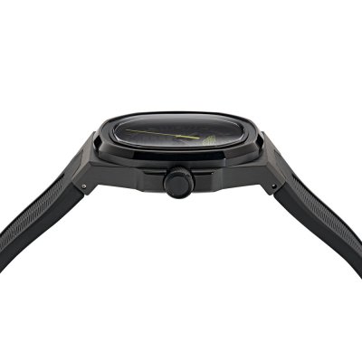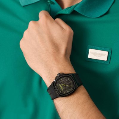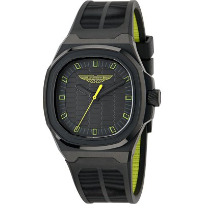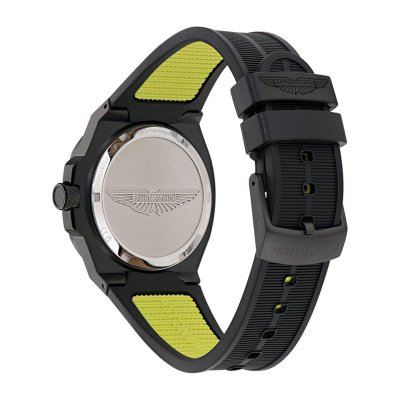 Diese Aston Martin Uhr hat ein Edelstahl Gehäuse mit einem Durchmesser von 40 mm und ist mit einem Armband aus Kautschuk versehen. In der Uhr arbeitet ein Timex Uhrwerk. Das Glas der Uhr besteht aus Mineral - Glas.