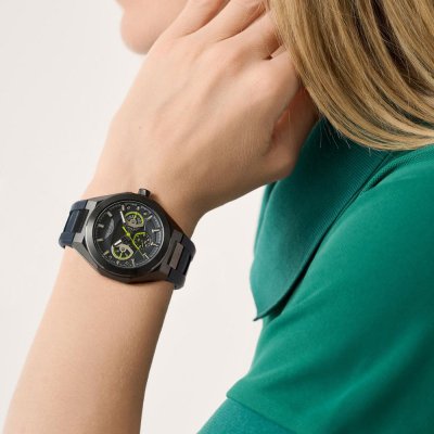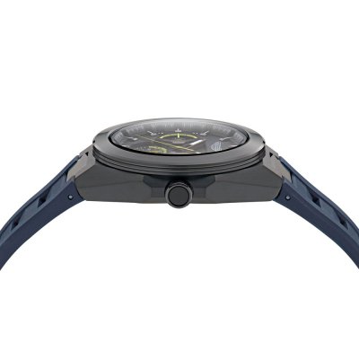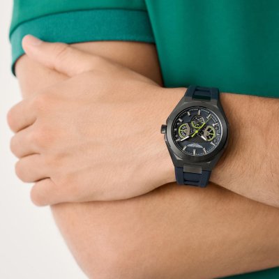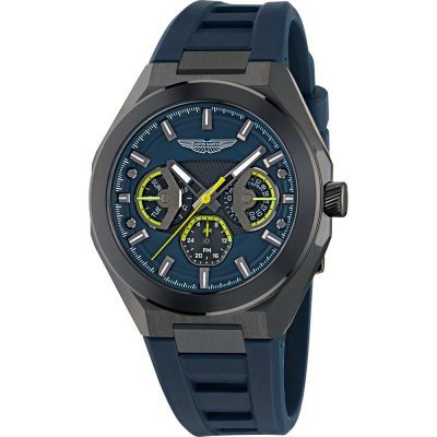 Diese Aston Martin Uhr hat ein Edelstahl Gehäuse mit einem Durchmesser von 42 mm und ist mit einem Armband aus Kautschuk versehen. In der Uhr arbeitet ein Timex Uhrwerk. Das Glas der Uhr besteht aus Mineral - Glas.
