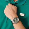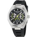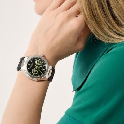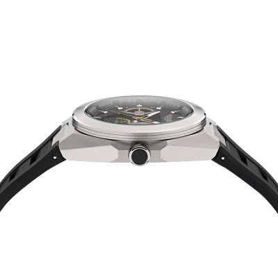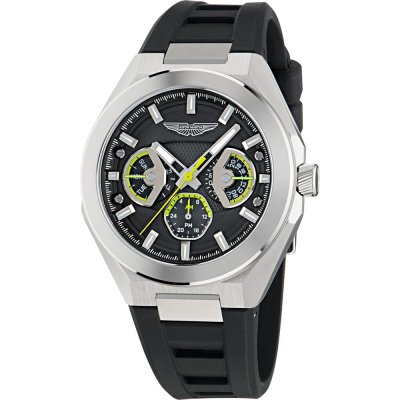 Diese Aston Martin Uhr hat ein Edelstahl Gehäuse mit einem Durchmesser von 42 mm und ist mit einem Armband aus Kautschuk versehen. In der Uhr arbeitet ein Timex Uhrwerk. Das Glas der Uhr besteht aus Mineral - Glas.