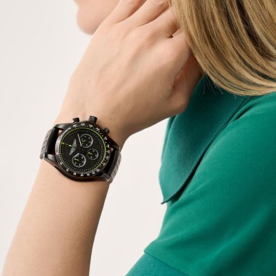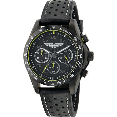 Diese Aston Martin Uhr hat ein Edelstahl Gehäuse mit einem Durchmesser von 42 mm und ist mit einem Armband aus Kautschuk versehen. In der Uhr arbeitet ein Timex Uhrwerk. Das Glas der Uhr besteht aus Mineral - Glas.