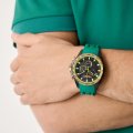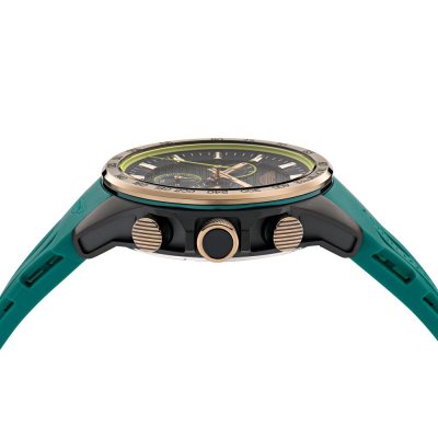 Diese Aston Martin Uhr hat ein Edelstahl Gehäuse mit einem Durchmesser von 44 mm und ist mit einem Armband aus Kautschuk versehen.