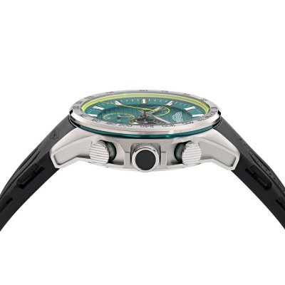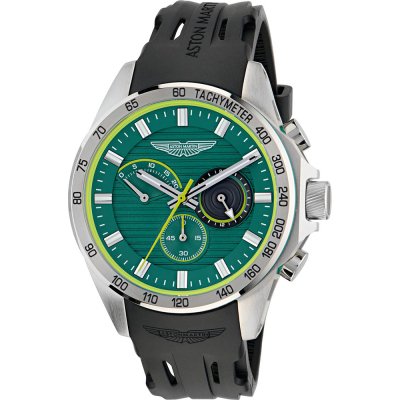 Diese Aston Martin Uhr hat ein Edelstahl Gehäuse mit einem Durchmesser von 44 mm und ist mit einem Armband aus Kautschuk versehen.