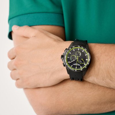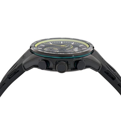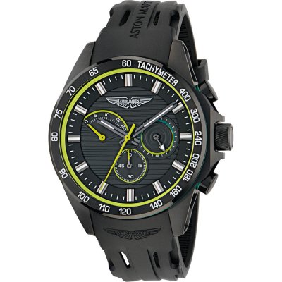 Diese Aston Martin Uhr hat ein Edelstahl Gehäuse mit einem Durchmesser von 44 mm und ist mit einem Armband aus Kautschuk versehen.