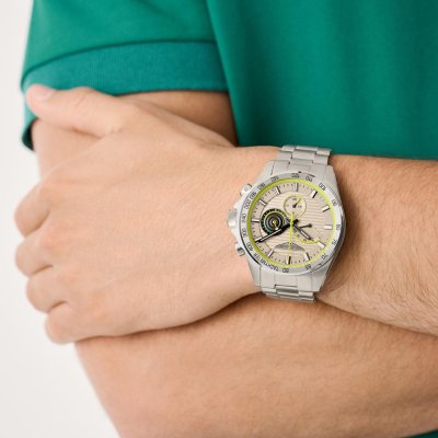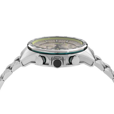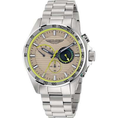 Diese Aston Martin Uhr hat ein Edelstahl Gehäuse mit einem Durchmesser von 44 mm und ist mit einem Armband aus Edelstahl versehen.