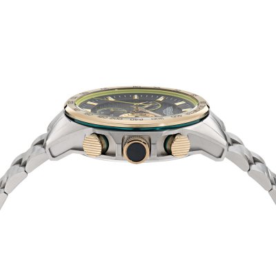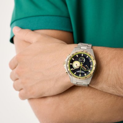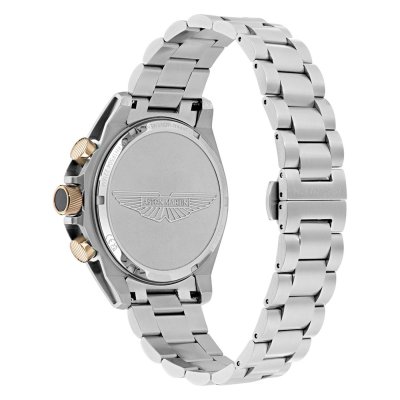 Diese Aston Martin Uhr hat ein Edelstahl Gehäuse mit einem Durchmesser von 44 mm und ist mit einem Armband aus Edelstahl versehen.