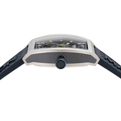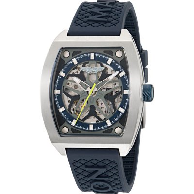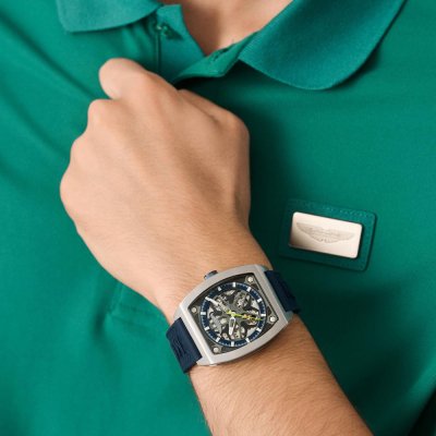 Diese Aston Martin Uhr hat ein Titan Gehäuse mit einem Durchmesser von 41 mm und ist mit einem Armband aus Kautschuk versehen. In der Uhr arbeitet ein Timex Uhrwerk. Das Glas der Uhr besteht aus Mineral - Glas.