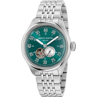 Diese Aston Martin Uhr hat ein Edelstahl Gehäuse mit einem Durchmesser von 41 mm und ist mit einem Armband aus Leder versehen.