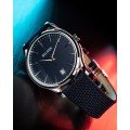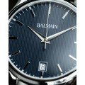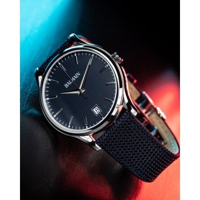Diese Balmain Uhr hat ein Edelstahl Gehäuse mit einem Durchmesser von 40 mm und ist mit einem Armband aus Textil versehen. In der Uhr arbeitet ein ETA Uhrwerk. Das Glas der Uhr besteht aus Sapphir - Glas.