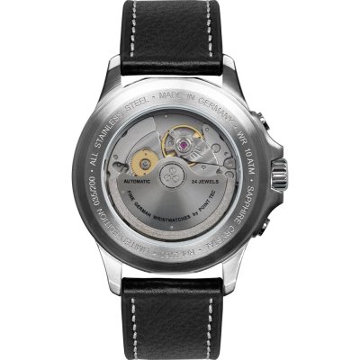 Diese Bauhaus Uhr hat ein Edelstahl Gehäuse mit einem Durchmesser von 40 mm und ist mit einem Armband aus Leder versehen. In der Uhr arbeitet ein Miyota Uhrwerk. Das Glas der Uhr besteht aus Sapphir - Glas.