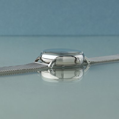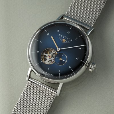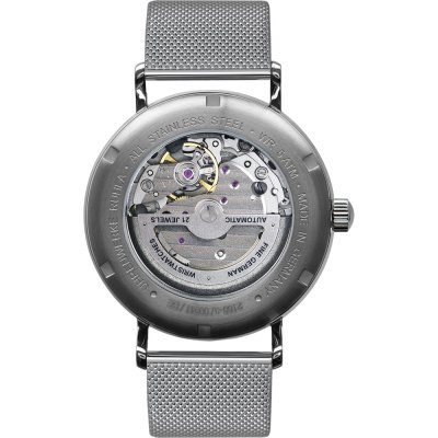 Diese Bauhaus Uhr hat ein Edelstahl Gehäuse mit einem Durchmesser von 41 mm und ist mit einem Armband aus Edelstahl versehen. In der Uhr arbeitet ein Miyota Uhrwerk. Das Glas der Uhr besteht aus K1 Mineral - Glas.