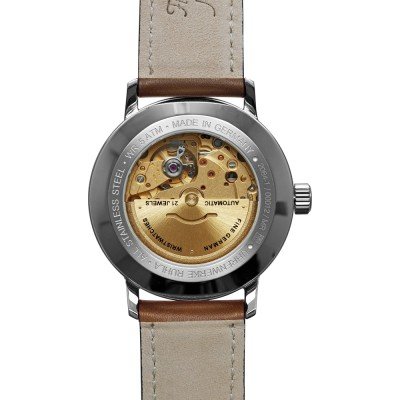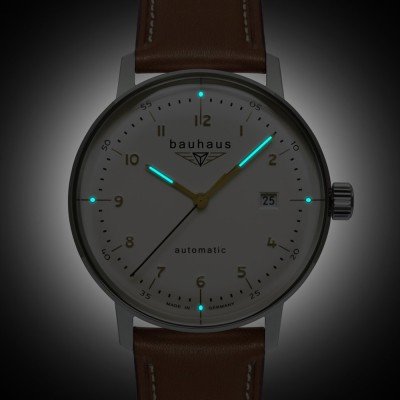 Diese Bauhaus Uhr hat ein Edelstahl Gehäuse mit einem Durchmesser von 41 mm und ist mit einem Armband aus Leder versehen. In der Uhr arbeitet ein Miyota Uhrwerk. Das Glas der Uhr besteht aus K1 Mineral - Glas.