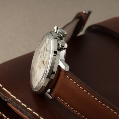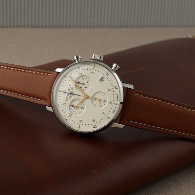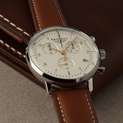 Diese Bauhaus Uhr hat ein Edelstahl Gehäuse mit einem Durchmesser von 41 mm und ist mit einem Armband aus Leder versehen. In der Uhr arbeitet ein ETA Uhrwerk. Das Glas der Uhr besteht aus K1 Mineral - Glas.
