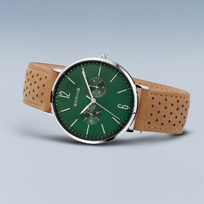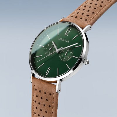Diese Bering Uhr hat ein Edelstahl Gehäuse mit einem Durchmesser von 40 mm und ist mit einem Armband aus Leder versehen. In der Uhr arbeitet ein Seiko Instruments Inc. Uhrwerk. Das Glas der Uhr besteht aus Sapphir - Glas.