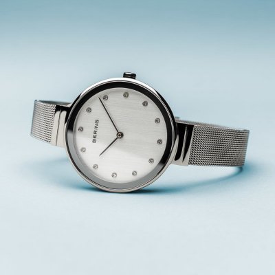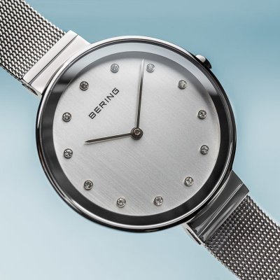 Diese Bering Uhr hat ein Edelstahl Gehäuse mit einem Durchmesser von 34 mm und ist mit einem Armband aus Edelstahl versehen. In der Uhr arbeitet ein Miyota Uhrwerk. Das Glas der Uhr besteht aus Sapphir - Glas.