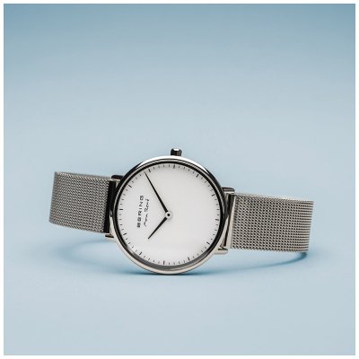 Diese Bering Uhr hat ein Edelstahl Gehäuse mit einem Durchmesser von 30 mm und ist mit einem Armband aus Edelstahl versehen. In der Uhr arbeitet ein Miyota Uhrwerk. Das Glas der Uhr besteht aus Sapphir - Glas.