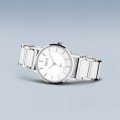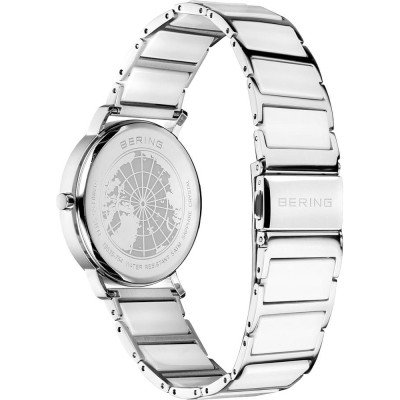 Diese Bering Uhr hat ein Edelstahl Gehäuse mit einem Durchmesser von 35 mm und ist mit einem Armband aus Keramik versehen. In der Uhr arbeitet ein Seiko Uhrwerk. Das Glas der Uhr besteht aus Sapphir - Glas.