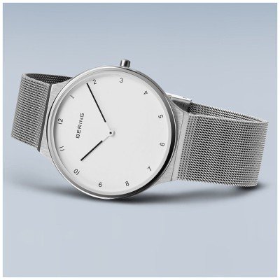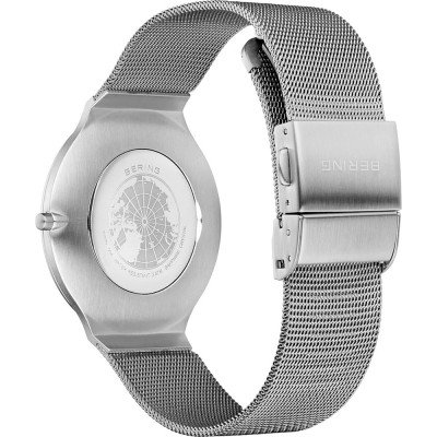 Diese Bering Uhr hat ein Edelstahl Gehäuse mit einem Durchmesser von 40 mm und ist mit einem Armband aus Edelstahl versehen. In der Uhr arbeitet ein Miyota Uhrwerk. Das Glas der Uhr besteht aus Sapphir - Glas.