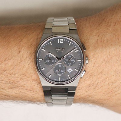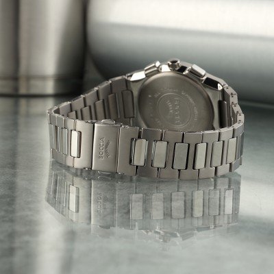 Diese Boccia Uhr hat ein Titan Gehäuse mit einem Durchmesser von 39 mm und ist mit einem Armband aus Titan versehen. In der Uhr arbeitet ein Miyota Uhrwerk. Das Glas der Uhr besteht aus Sapphir - Glas.