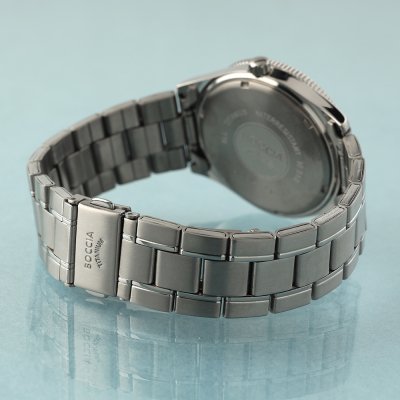 Diese Boccia Uhr hat ein Titan Gehäuse mit einem Durchmesser von 39 mm und ist mit einem Armband aus Titan versehen. In der Uhr arbeitet ein Miyota Uhrwerk. Das Glas der Uhr besteht aus Mineral - Glas.
