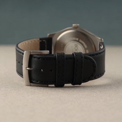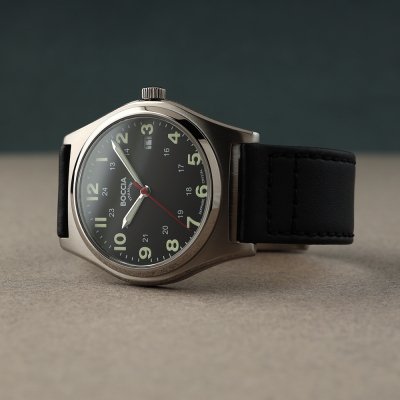 Diese Boccia Uhr hat ein Titan Gehäuse mit einem Durchmesser von 39 mm und ist mit einem Armband aus Leder versehen. In der Uhr arbeitet ein Miyota Uhrwerk. Das Glas der Uhr besteht aus Sapphir - Glas.