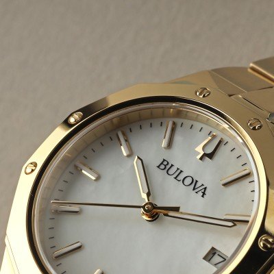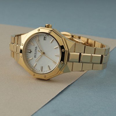 Diese Bulova Uhr hat ein Edelstahl Gehäuse mit einem Durchmesser von 32 mm und ist mit einem Armband aus Edelstahl versehen. In der Uhr arbeitet ein Miyota Uhrwerk. Das Glas der Uhr besteht aus Sapphir - Glas.