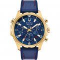 Diese Bulova Uhr hat ein Edelstahl Gehäuse mit einem Durchmesser von 43 mm und ist mit einem Armband aus Leder oder Silikon versehen. In der Uhr arbeitet ein Miyota Uhrwerk. Das Glas der Uhr besteht aus Mineral - Glas.