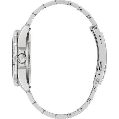 Diese Bulova Uhr hat ein Edelstahl Gehäuse mit einem Durchmesser von 41 mm und ist mit einem Armband aus Edelstahl versehen. In der Uhr arbeitet ein Miyota Uhrwerk. Das Glas der Uhr besteht aus Sapphir - Glas.