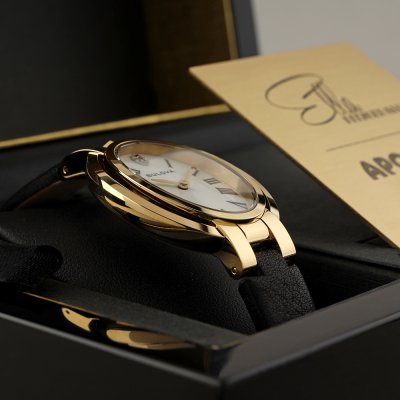 Diese Bulova Uhr hat ein Edelstahl Gehäuse mit einem Durchmesser von 28 mm und ist mit einem Armband aus Leder versehen. In der Uhr arbeitet ein Miyota Uhrwerk. Das Glas der Uhr besteht aus Sapphir - Glas.