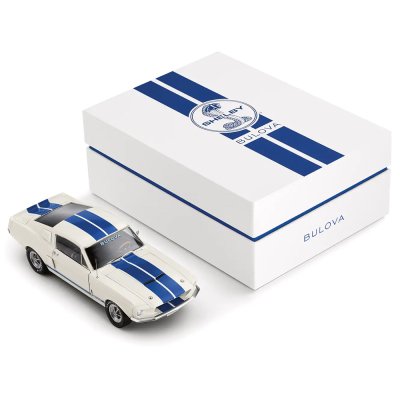 Dieser aufregende Citizen Bull's Head Chronograph in limitierter Auflage wurde in Zusammenarbeit mit dem Muscle Car Customizer Carroll Shelby entwickelt, um das 150-jährige Jubiläum der Marke zu feiern. Die Hauptfarben der Uhr sind von Shelbys Markenzeichen Blau und Weiß abgeleitet, die das Zifferblatt und das Kautschukarmband akzentuieren. Das kantige Bullhead-Gehäuse ist von der Kraft des Shelby Ford Mustang GT500 von 1967 und seinen aerodynamischen Linien inspiriert. Und schließlich ist das Shelby-Logo auf dem Zifferblatt bei 3 Uhr zu sehen. Die Uhr verfügt über eine Chronographenfunktion mit einer erstaunlichen Ganggenauigkeit von 1/1000 Sekunde, angetrieben von Bulovas eigenem hochpräzisen Quarzwerk Precisionist. Jeder der 7500 Citizen Shelby Chronographen ist einzeln nummeriert und mit einem Gehäuseboden mit Shelbys Unterschrift versehen. Die Uhr wird in einer limitierten Box mit einem 1:24-Druckgussmodell des GT500 geliefert.