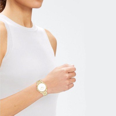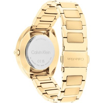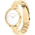 Diese Calvin Klein Uhr hat ein Edelstahl Gehäuse mit einem Durchmesser von 34 mm und ist mit einem Armband aus Metall versehen. In der Uhr arbeitet ein Seiko Instruments Inc. Uhrwerk. Das Glas der Uhr besteht aus Mineral - Glas.