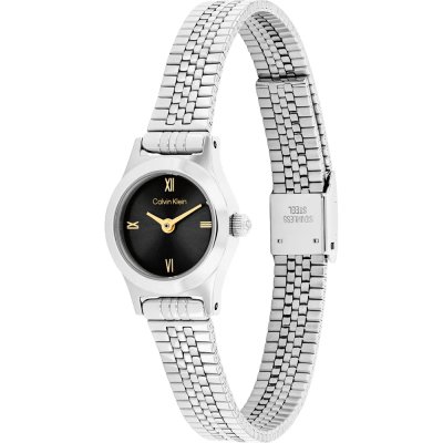 Diese Calvin Klein Uhr hat ein Edelstahl Gehäuse mit einem Durchmesser von 18 mm und ist mit einem Armband aus Edelstahl versehen. In der Uhr arbeitet ein Seiko Instruments Inc. Uhrwerk. Das Glas der Uhr besteht aus Mineral - Glas.