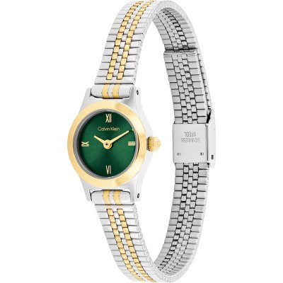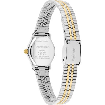 Diese Calvin Klein Uhr hat ein Edelstahl Gehäuse mit einem Durchmesser von 18 mm und ist mit einem Armband aus Edelstahl versehen. In der Uhr arbeitet ein Seiko Instruments Inc. Uhrwerk. Das Glas der Uhr besteht aus Mineral - Glas.