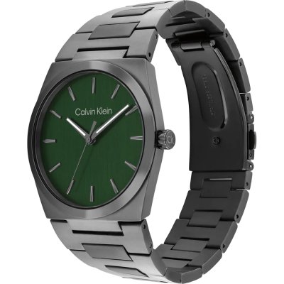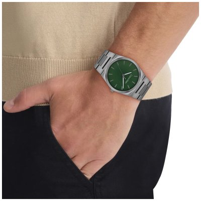 Diese Calvin Klein Uhr hat ein Edelstahl Gehäuse mit einem Durchmesser von 40 mm und ist mit einem Armband aus Edelstahl versehen. In der Uhr arbeitet ein Seiko Instruments Inc. Uhrwerk. Das Glas der Uhr besteht aus Mineral - Glas.