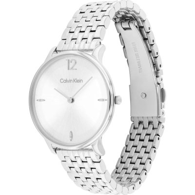Diese Calvin Klein Uhr hat ein Edelstahl Gehäuse mit einem Durchmesser von 34 mm und ist mit einem Armband aus Edelstahl versehen. In der Uhr arbeitet ein Seiko Instruments Inc. Uhrwerk. Das Glas der Uhr besteht aus Mineral - Glas.