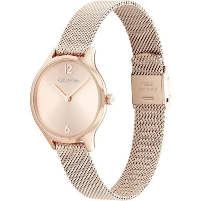 Diese Calvin Klein Uhr hat ein Edelstahl Gehäuse mit einem Durchmesser von 28 mm und ist mit einem Armband aus Edelstahl versehen. In der Uhr arbeitet ein Seiko Instruments Inc. Uhrwerk. Das Glas der Uhr besteht aus Mineral - Glas.