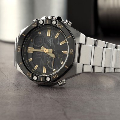 Diese Casio Edifice Uhr hat ein Edelstahl Gehäuse mit einem Durchmesser von 48 mm und ist mit einem Armband aus Metall versehen. In der Uhr arbeitet ein Casio Uhrwerk. Das Glas der Uhr besteht aus Mineral - Glas.