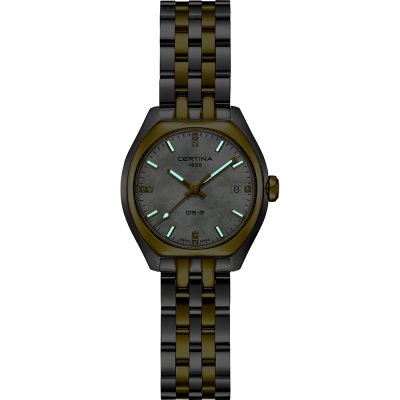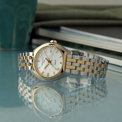 Diese Certina Uhr hat ein Edelstahl Gehäuse mit einem Durchmesser von 28 mm und ist mit einem Armband aus Edelstahl versehen. In der Uhr arbeitet ein ETA Uhrwerk. Das Glas der Uhr besteht aus Einfaches reflektionsfreies Saphirglas - Glas.
