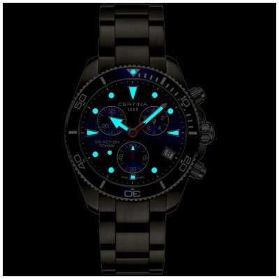 Diese Certina Uhr hat ein Titan Gehäuse mit einem Durchmesser von 42 mm und ist mit einem Armband aus Titan versehen. In der Uhr arbeitet ein ETA Uhrwerk. Das Glas der Uhr besteht aus Einfaches reflektionsfreies Saphirglas - Glas.
