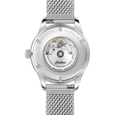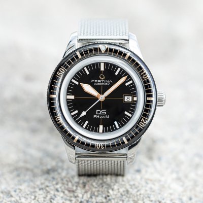Diese sehr stilvolle Certina Taucheruhr ist eine moderne Neuauflage eines Klassikers. Die gewölbte Keramiklünette und das kratzfeste Saphirglas verleihen der DS Heritage einen Retro-Look, ebenso wie das Armband aus Mesh oder gegerbtem Leder. Angetrieben wird die Uhr von einem automatischen Powermatic-Uhrwerk mit bis zu 80 Stunden Gangreserve und einer magnetfeldresistenten NivachronTM-Unruhspirale.