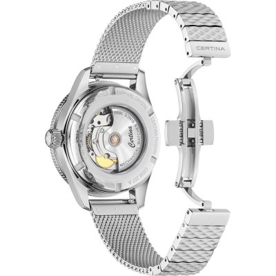 Diese Certina Uhr hat ein Edelstahl Gehäuse mit einem Durchmesser von 39 mm und ist mit einem Armband aus Edelstahl versehen. In der Uhr arbeitet ein ETA Uhrwerk. Das Glas der Uhr besteht aus Sapphir - Glas.