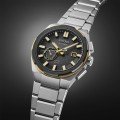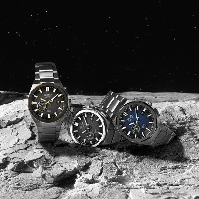 Das Gehäuse besteht aus hochfestem Titan mit einer superharten Beschichtung, die für Leichtigkeit und Widerstandsfähigkeit sorgt. Die Lünette besteht aus zwei Schichten, einer Kombination aus Titan und Keramik, mit sechs Einkerbungen, die die untere Schicht freilegen und so einen unverwechselbaren optischen Effekt erzeugen. Das Zifferblatt ist grau mit einem feinkörnigen Muster, das an die Oberfläche eines Planeten erinnert, und mit goldenen Details verziert, die an die Strahlen der Sonne erinnern. Das Armband ist aus Titan mit Dreifach-Sicherheitsfaltschließe und Smart Adjuster-Funktion für eine präzise Einstellung. Das Saphirglas mit Super-Clear-Beschichtung sorgt für optimale Sicht.