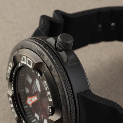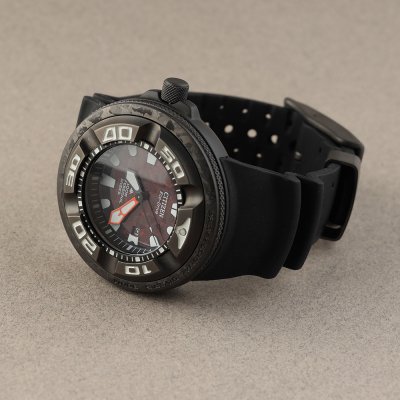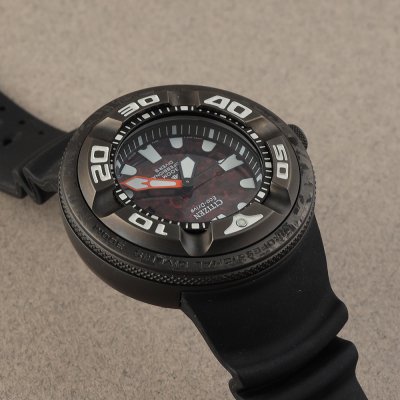 Diese Citizen Uhr hat ein Edelstahl Gehäuse mit einem Durchmesser von 48 mm und ist mit einem Armband aus Kautschuk versehen. In der Uhr arbeitet ein Citizen Uhrwerk. Das Glas der Uhr besteht aus Gehärtetem Mineral - Glas.